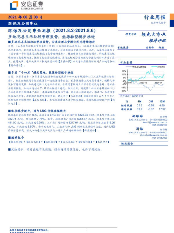 【安信证券】【20210808】环保及公用事业周报:多地完善生活垃圾管理监督,能源转型稳步推进-17页 行业研究