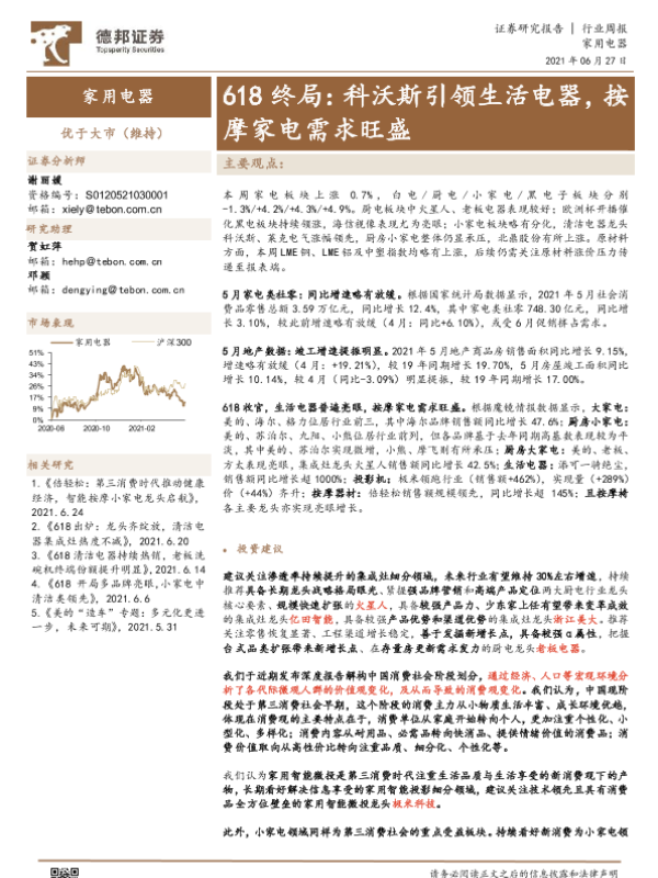 【德邦证券】【20210627】20210627-德邦证券-家用电器行业周报:618终局:科沃斯引领生活电器,按摩家电需求旺盛-21页 行业研究