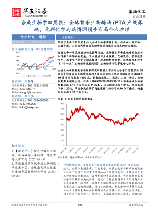 【华安证券】【202510】合成生物学双周报:全球首条生物酶法 rPTA产线落地,元利化学与路博润携手布局个人护理-18页 证券期货研究报告