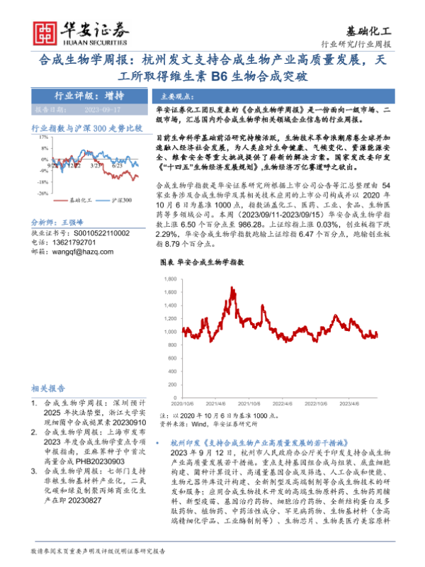 【华安证券】【20230917】合成生物学周报:杭州发文支持合成生物产业高质量发展,天工所取得维生素B6生物合成突破-25页 行业研究