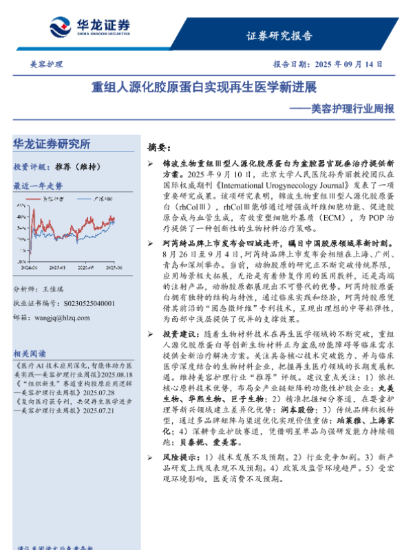 【华龙证券】【202509】重组人源化胶原蛋白实现再生医学新进展——美容护理行业周报-10页 证券期货研究报告