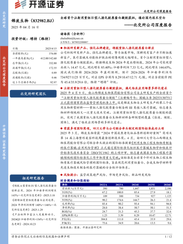 【开源证券】【20250416】锦波生物北交所公司深度报告:全球首个注射用重组Ⅲ型人源化胶原蛋白凝胶获批,填补国内技术空白-12页 公司研究