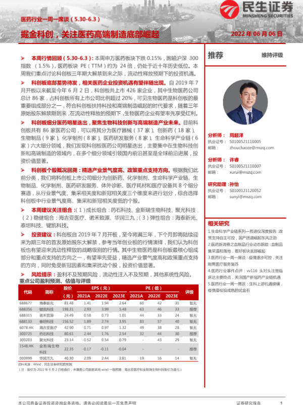 【民生证券】【20220606】医药行业一周一席谈:掘金科创,关注医药高端制造底部崛起-18页 行业研究