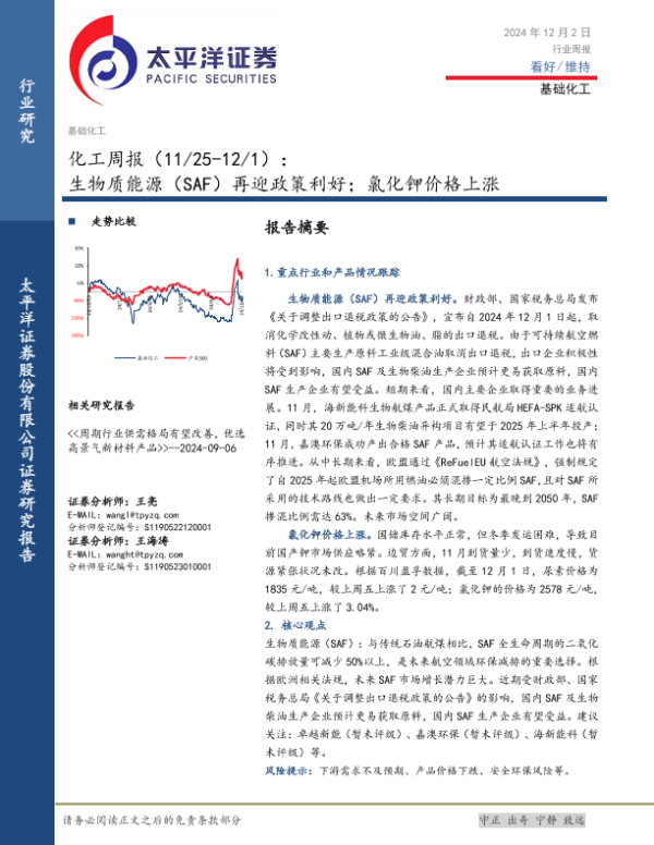 【太平洋证券】【20241202】20241202-太平洋-化工行业周报:生物质能源(SAF)再迎政策利好;氯化钾价格上涨-32页 行业研究