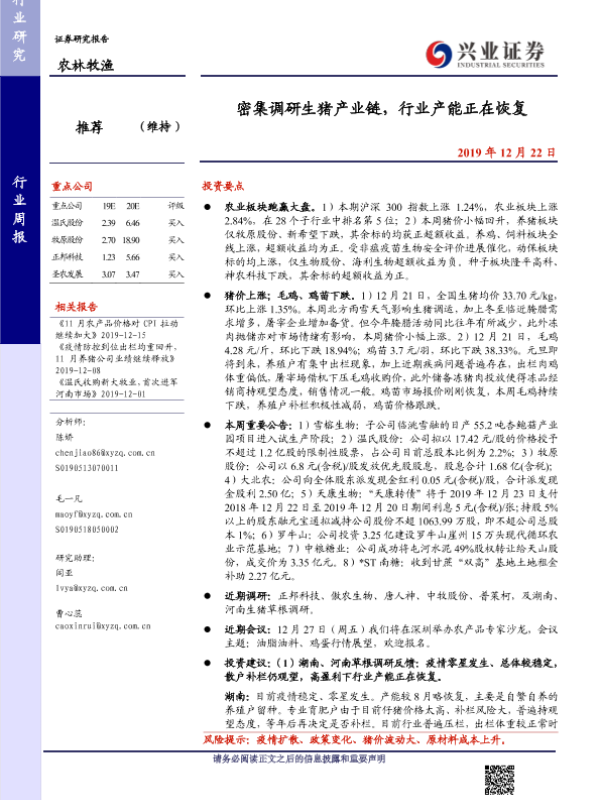【兴业证券】【20191222】20191222-兴业证券-农林牧渔行业周报:密集调研生猪产业链,行业产能正在恢复-15页 行业研究