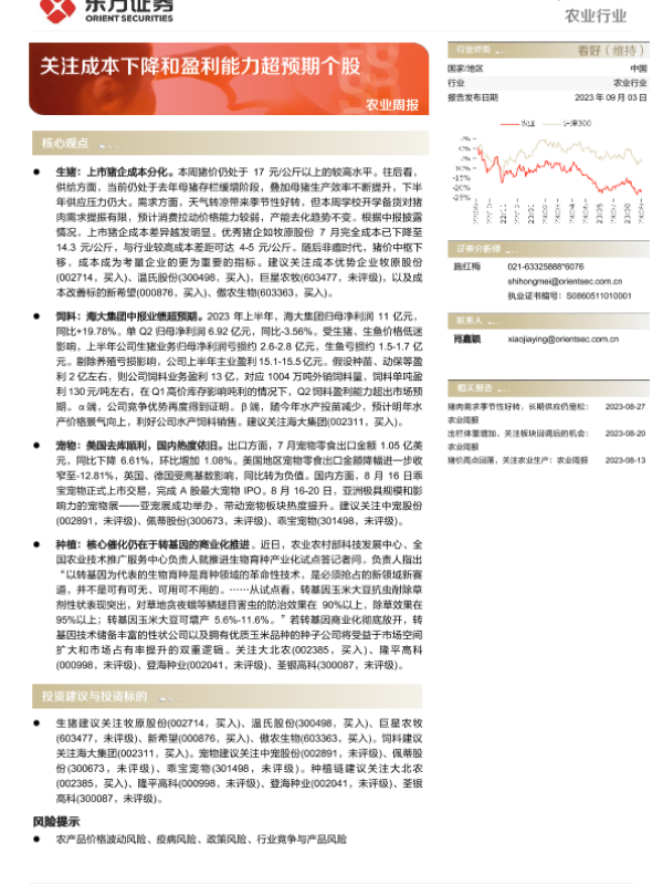 【东方证券】【20230903】20230903-东方证券-农业周报:关注成本下降和盈利能力超预期个股-11页 行业研究