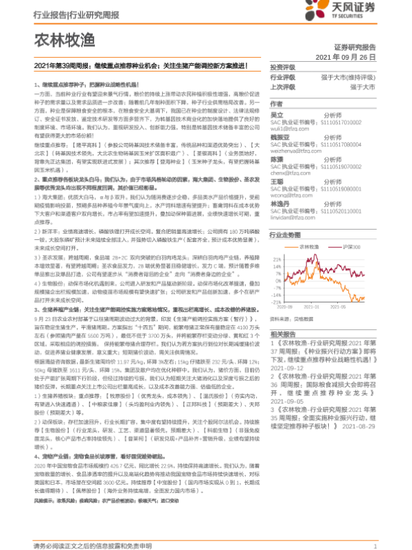 【天风证券】【20210926】2021年第39周周报:继续重点推荐种业机会;关注生猪产能调控新方案推进!-14页 行业研究