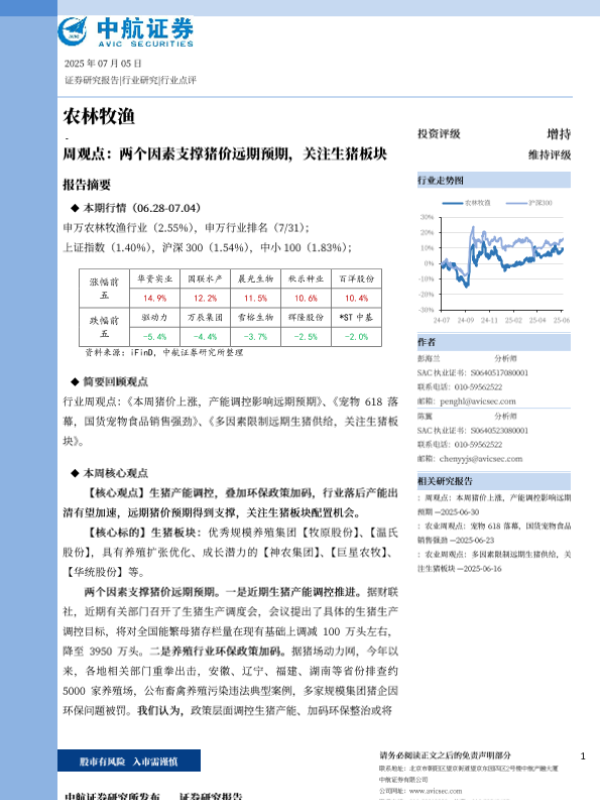 【中航证券】【20250705】农林牧渔周观点 两个因素支撑猪价远期预期, 关注生猪板块-13页 行业研究