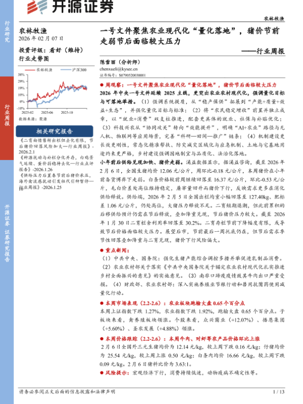 【开源证券】【202602】农林牧渔行业周报:一号文件聚焦农业现代化“量化落地”,猪价节前走弱节后面临较大压力-13页 行业研究