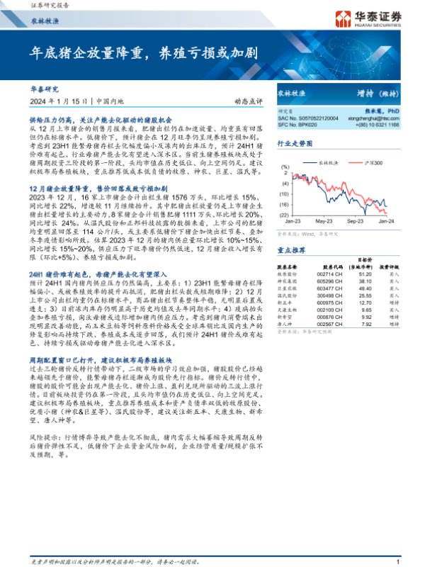 【华泰证券】【20240115】20240115-华泰证券-农林牧渔动态点评:年底猪企放量降重,养殖亏损或加剧-10页 行业研究