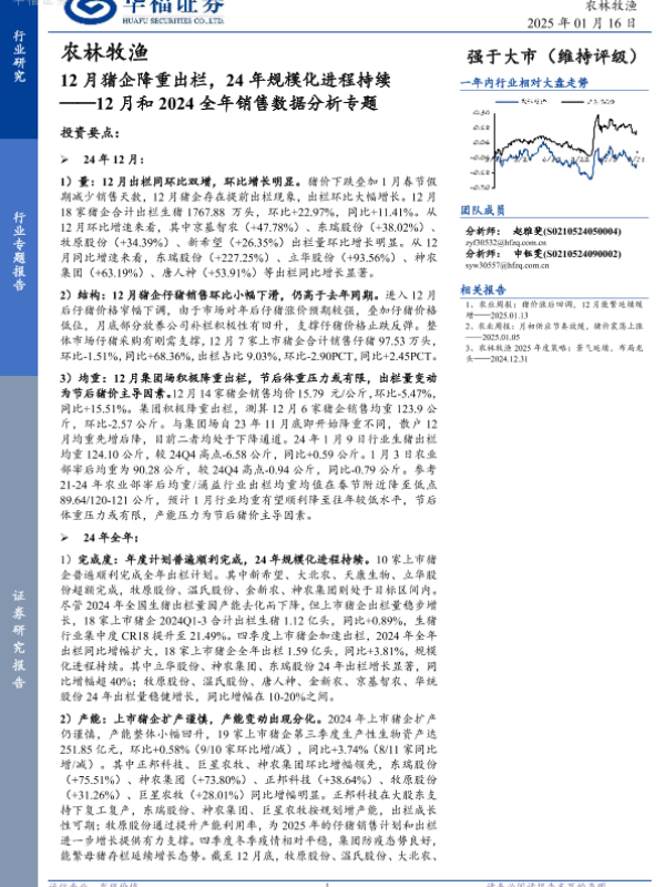 【华福证券】【20250116】农林牧渔12月和2024全年销售数据分析专题:12月猪企降重出栏,24年规模化进程持续-12页 行业研究