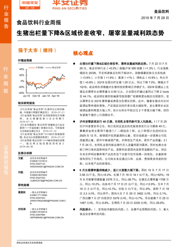 【平安证券】【20190728】食品饮料行业周报:生猪出栏量下降&区域价差收窄,屠宰呈量减利跌态势-6页 行业研究