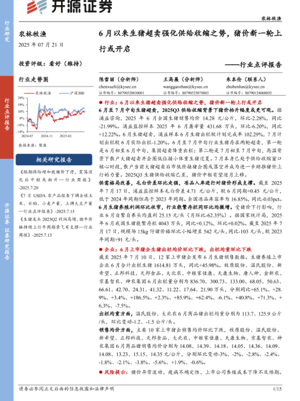 【开源证券】【20250721】6月以来生猪超卖强化供给收缩之势,猪价新一轮上行或开启-15页 行业研究