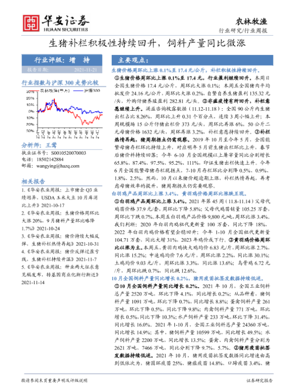 【华安证券】【20211121】20211121-华安证券-农林牧渔行业周报:生猪补栏积极性持续回升,饲料产量同比微涨-39页 行业研究