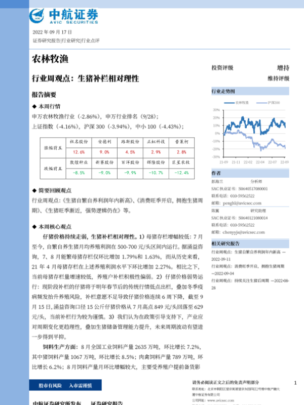 【中航证券】【20220917】农林牧渔行业周观点:生猪补栏相对理性-14页 行业研究