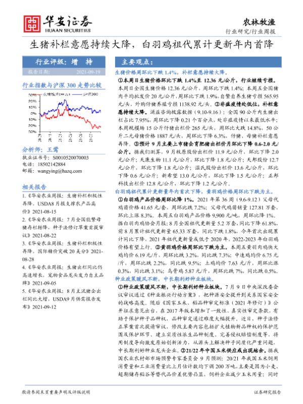 【华安证券】【20210919】20210919-华安证券-农林牧渔行业周报:生猪补栏意愿持续大降,白羽鸡祖代累计更新年内首降-44页 行业研究