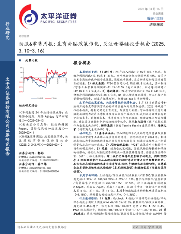 【太平洋证券】【20250316】纺服&零售周报:生育补贴政策催化,关注母婴链投资机会-13页 行业研究