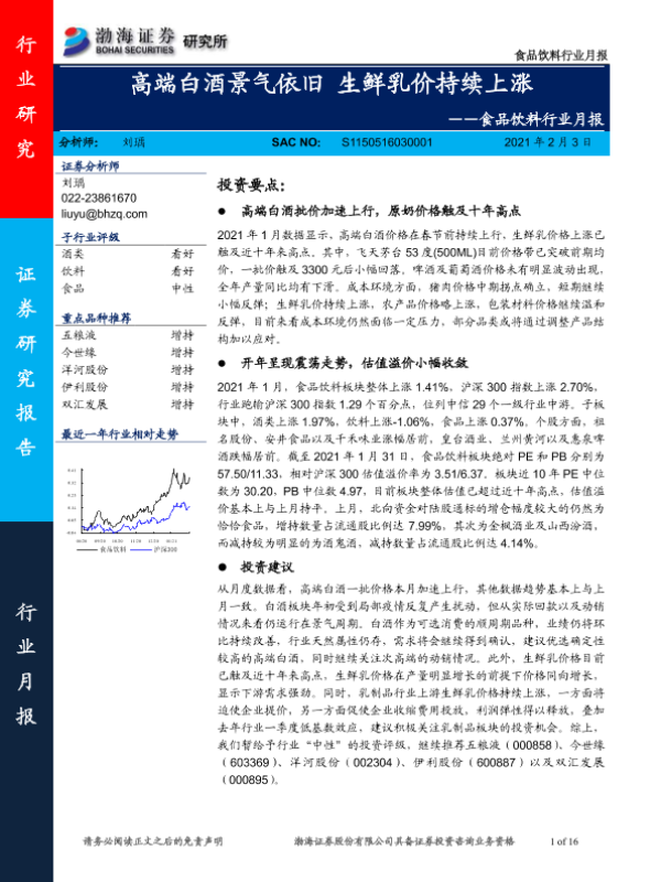 【渤海证券】【20210203】食品饮料行业月报:高端白酒景气依旧 生鲜乳价持续上涨-16页 行业研究