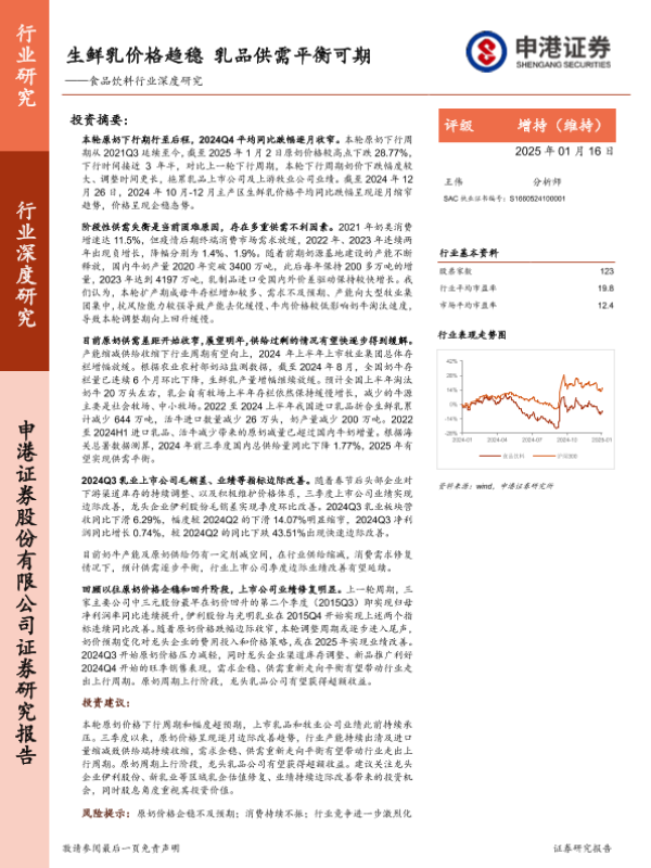 【申港证券】【20250116】食品饮料行业深度研究:生鲜乳价格趋稳 乳品供需平衡可期-24页 行业研究
