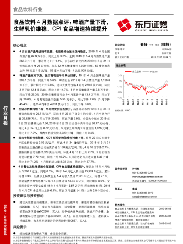 【东方证券】【20190604】食品饮料4月数据点评:啤酒产量下滑,生鲜乳价维稳,CPI食品增速持续提升-14页 行业研究