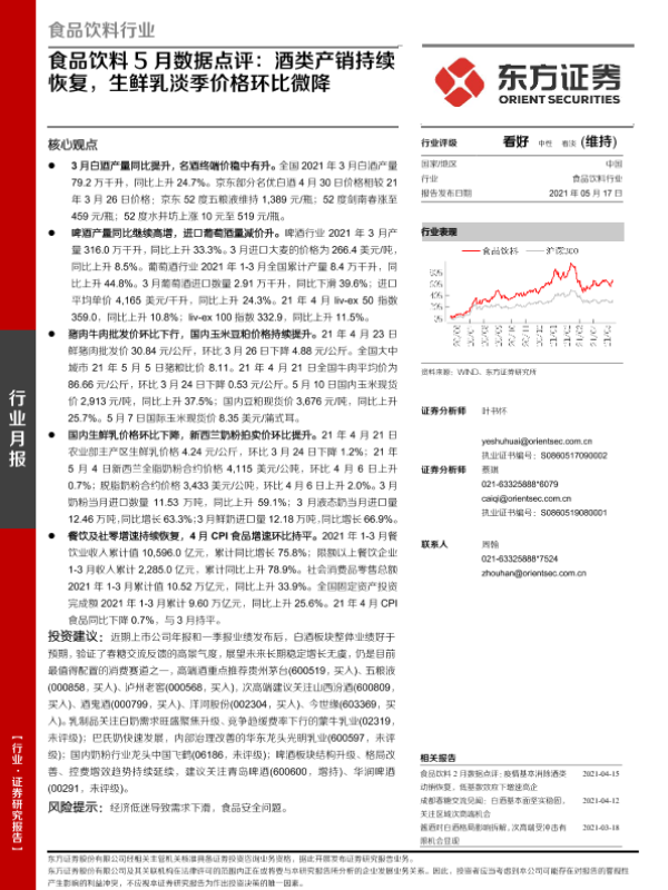 【东方证券】【20210517】食品饮料5月数据点评:酒类产销持续恢复,生鲜乳淡季价格环比微降-14页 行业研究