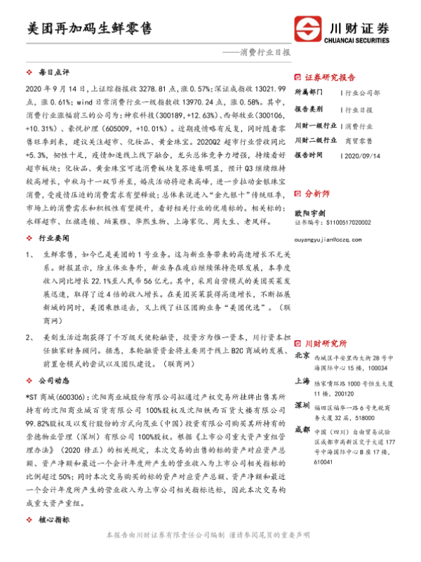 【川财证券】【20200914】消费行业日报:美团再加码生鲜零售-3页 行业研究