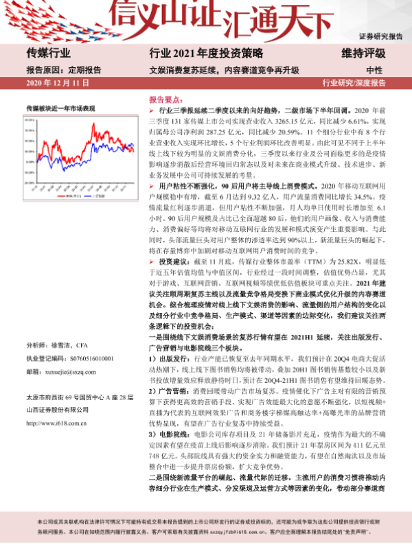 【山西证券】【20201211】20201211-山西证券-传媒行业2021年度投资策略:文娱消费复苏延续,内容赛道竞争再升级-65页 行业研究