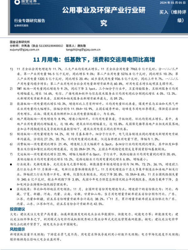 【国金证券】【20240105】11月用电:低基数下,消费和交运用电同比高增-17页 行业研究