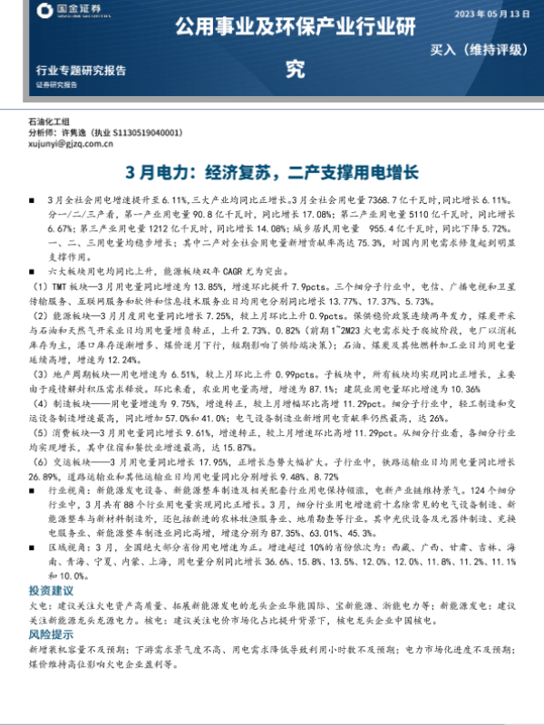 【国金证券】【20230513】3月电力:经济复苏,二产支撑用电增长-17页 行业研究
