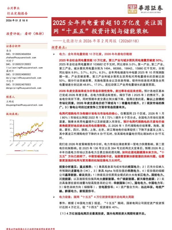【华源证券】【202601】大能源行业 2026年第 2周周报(20260118)——2025全年用电量首超 10万亿度 关注国网“十五五”投资计划与储能装机-17页 证券期货研究报告