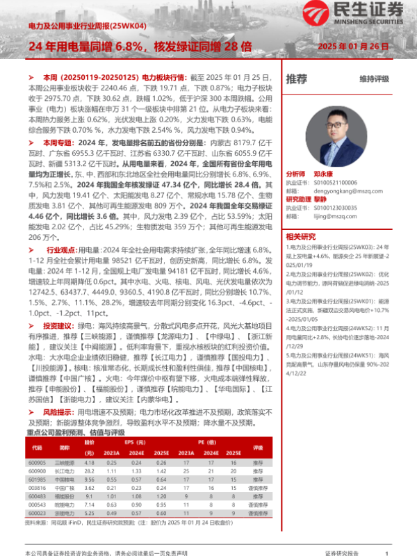 【民生证券】【20250126】电力及公用事业行业周报:24年用电量同增6.8%,核发绿证同增28倍-25页 行业研究