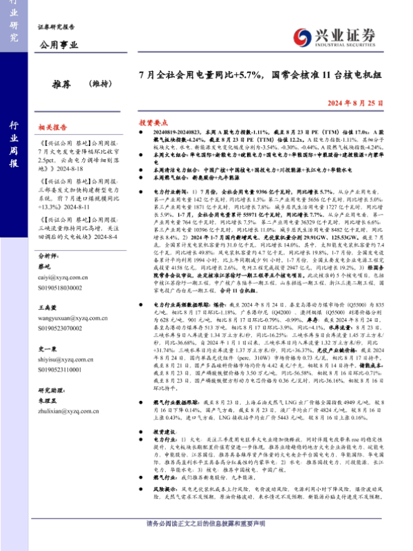 【兴业证券】【20240825】7月全社会用电量同比+5.7%,国常会核准11台核电机组-23页 行业研究