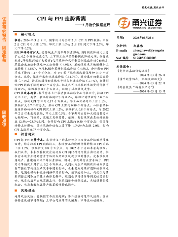 【甬兴证券】【20240328】2月物价数据点评:CPI与PPI走势背离-10页 行业研究