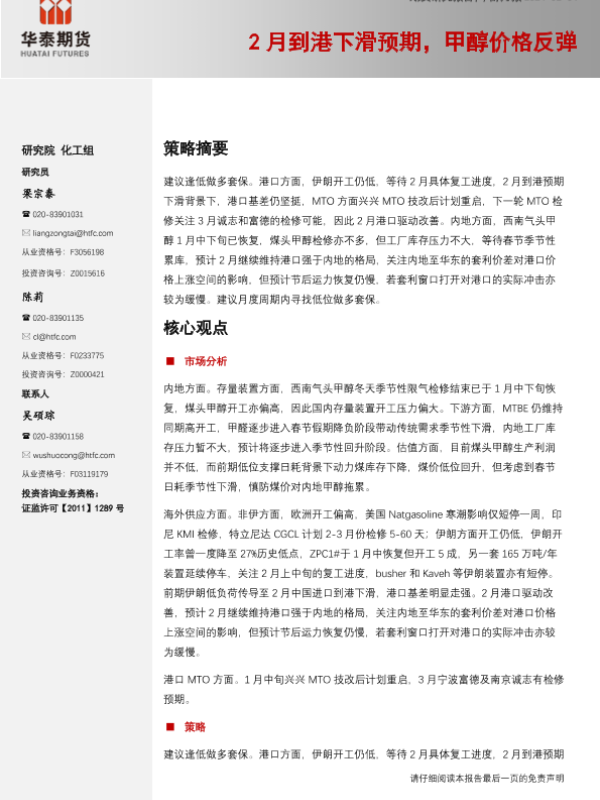 【华泰期货】【20240204】甲醇月报:2月到港下滑预期,甲醇价格反弹-15页 行业研究