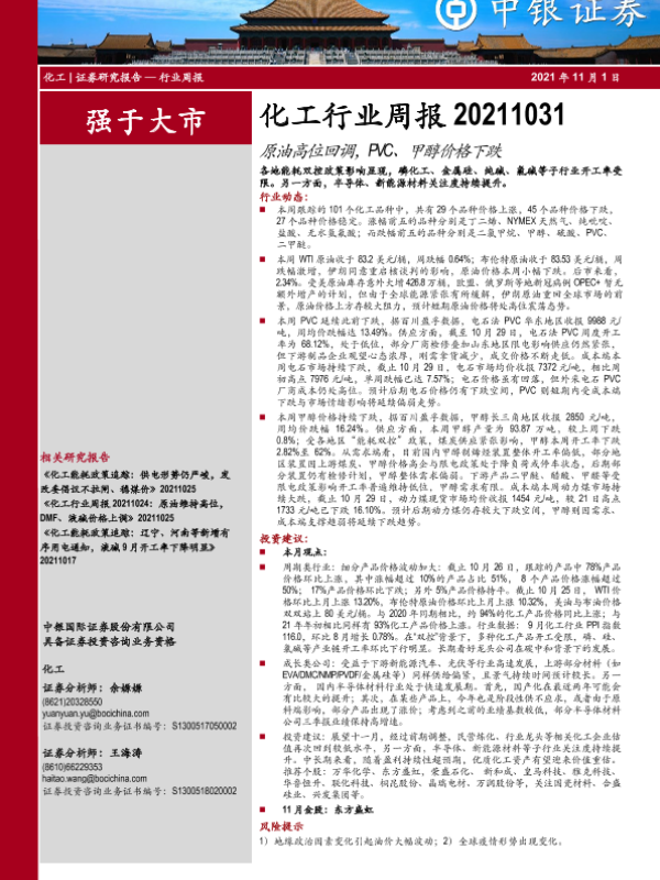 【中银证券】【20211101】20211101-中银证券-化工行业周报:原油高位回调,PVC、甲醇价格下跌-14页 行业研究