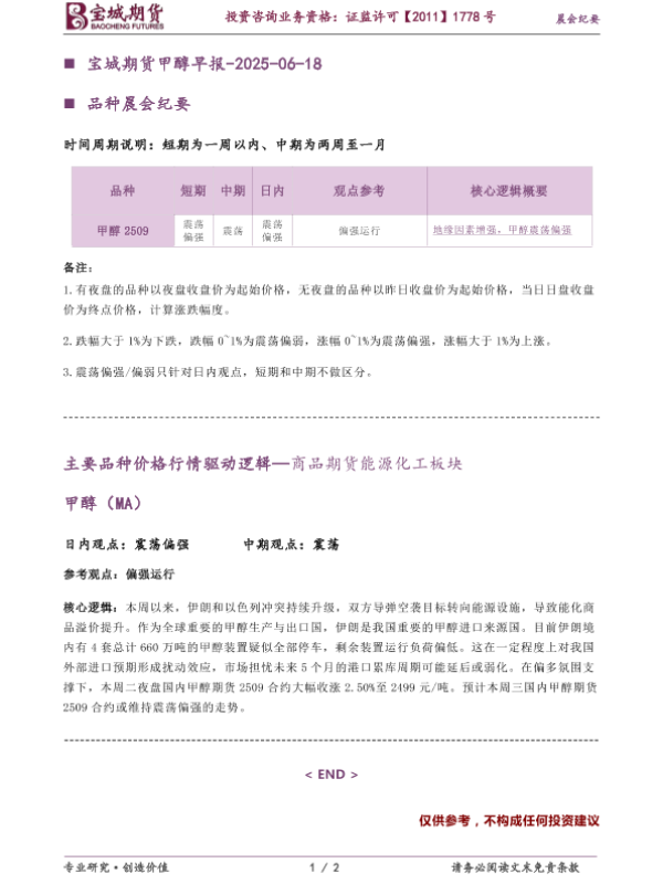 【宝城期货】【20250618】宝城期货甲醇早报-2页 证券期货研究报告