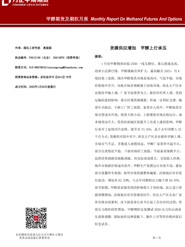 【方正中期期货】【20220130】甲醇期货及期权月报-21页 行业研究