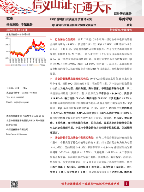 【山西证券】【20190814】20190814-山西证券-家电专题报告:19Q2家电行业资金仓位变动研究 Q2家电行业基金持仓比例变动居首位-11页 行业研究