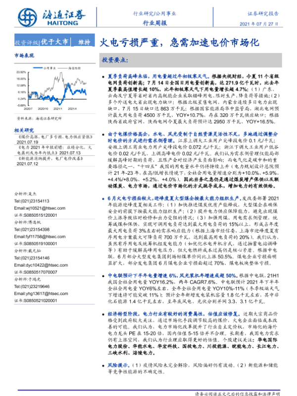 【海通证券】【20210727】公用事业行业周报:火电亏损严重,急需加速电价市场化-2页 行业研究
