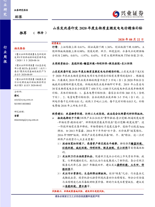 【兴业证券】【20200822】2020年度生物质直燃发电电价精准补贴-8页 行业研究