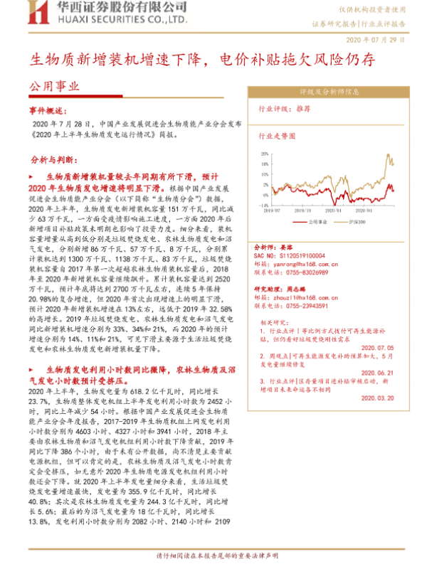 【华西证券】【20200729】生物质新增装机增速下降,电价补贴拖欠风险仍存-4页 行业研究
