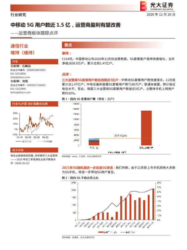 【光大证券】【20201220】通信行业运营商板块跟踪点评:中移动5G用户数近1.5亿,运营商盈利有望改善-3页 行业研究