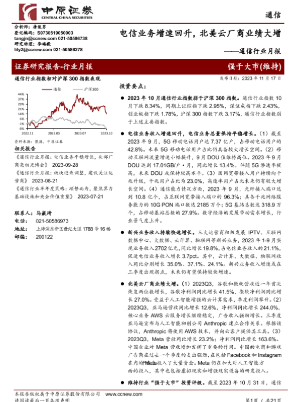 【中原证券】【20231117】通信行业月报:电信业务增速回升,北美云厂商业绩大增-21页 行业研究