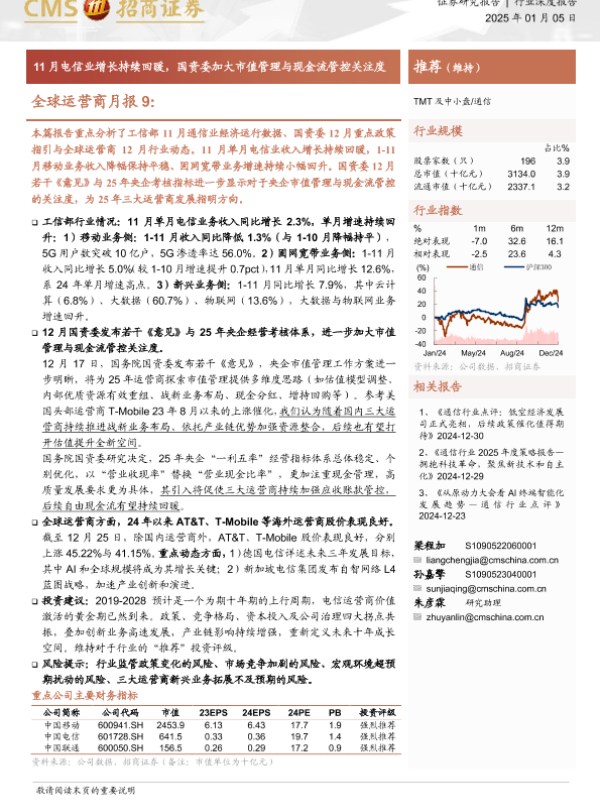 【海通证券】【20250105】全球运营商月报9:11月电信业增长持续回暖,国资委加大市值管理与现金流管控关注度-26页 行业研究