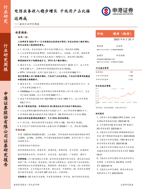【申港证券】【20230625】20230625-申港证券-通信行业研究周报:电信业务收入稳步增长 千兆用户占比接近两成-11页 行业研究