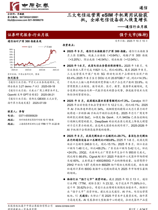 【中原证券】【202510】通信行业月报:三大电信运营商eSIM手机商用试验获批,全球电信设备收入恢复增长-34页 证券期货研究报告