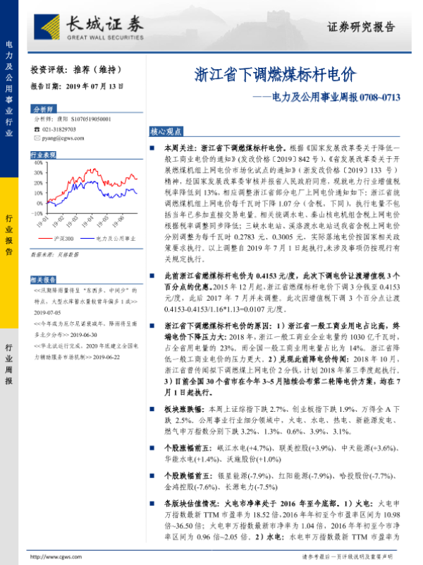【长城证券】【20190713】电力及公用事业周报:浙江省下调燃煤标杆电价-14页 行业研究