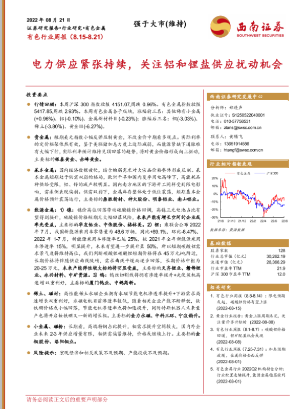 【西南证券】【20220821】20220821-西南证券-有色行业周报:电力供应紧张持续,关注铝和锂盐供应扰动机会-20页 行业研究