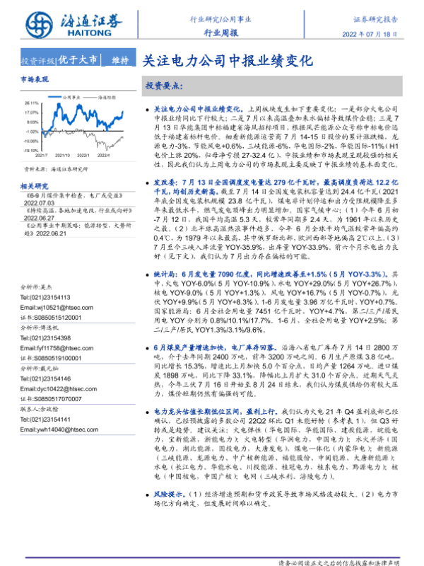 【海通证券】【20220718】关注电力公司中报业绩变化-3页 行业研究