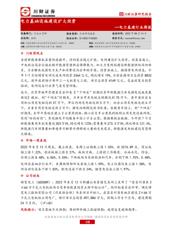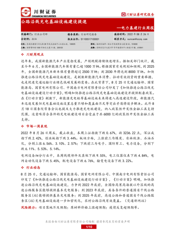 【川财证券】【20220826】电力基建行业周报:公路沿线充电基础设施建设提速-10页 行业研究